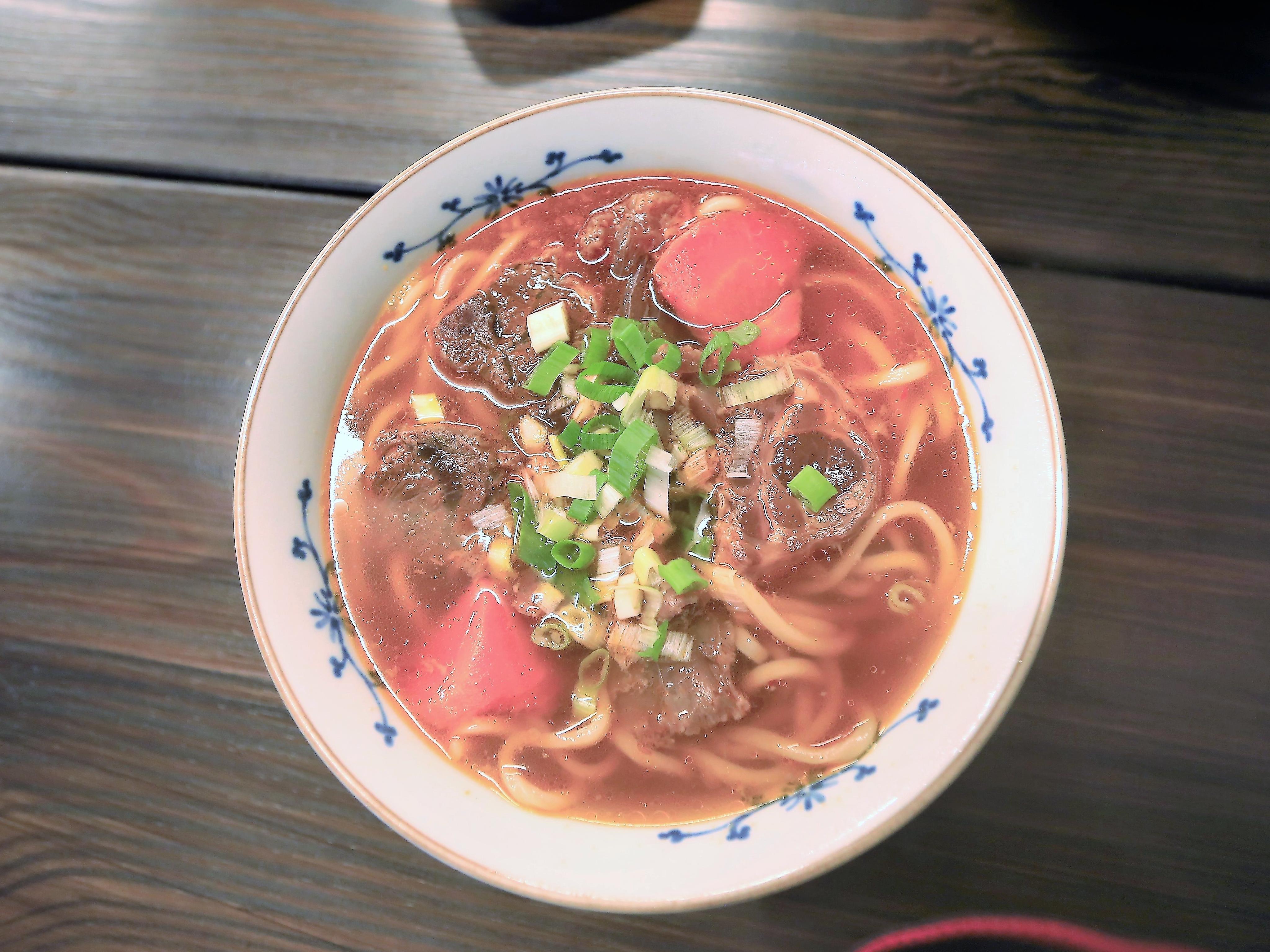 他們賣的牛肉麵和別家的是有不同,牛肉和牛腱用番茄、紅蘿蔔燉煮,煮到軟爛,呈現的是原味的湯甜、肉香;麵是當地有機的池上米,加上麵粉揉製,入口彈Q。整體感覺是,牛肉軟爛香甜,口味沒配酸菜的厚重,麵條彈Q,湯原汁原味,微辣,就是不吃辣的人也能接受。