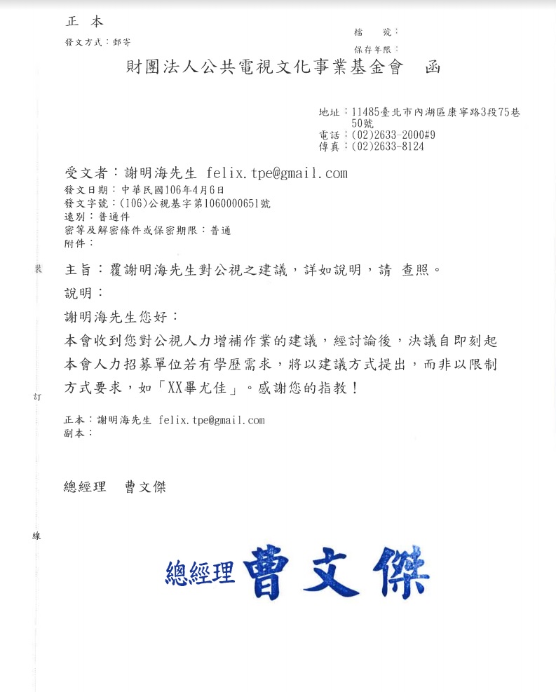 感謝公共電視曹總經理以及諸位董事女士先生。