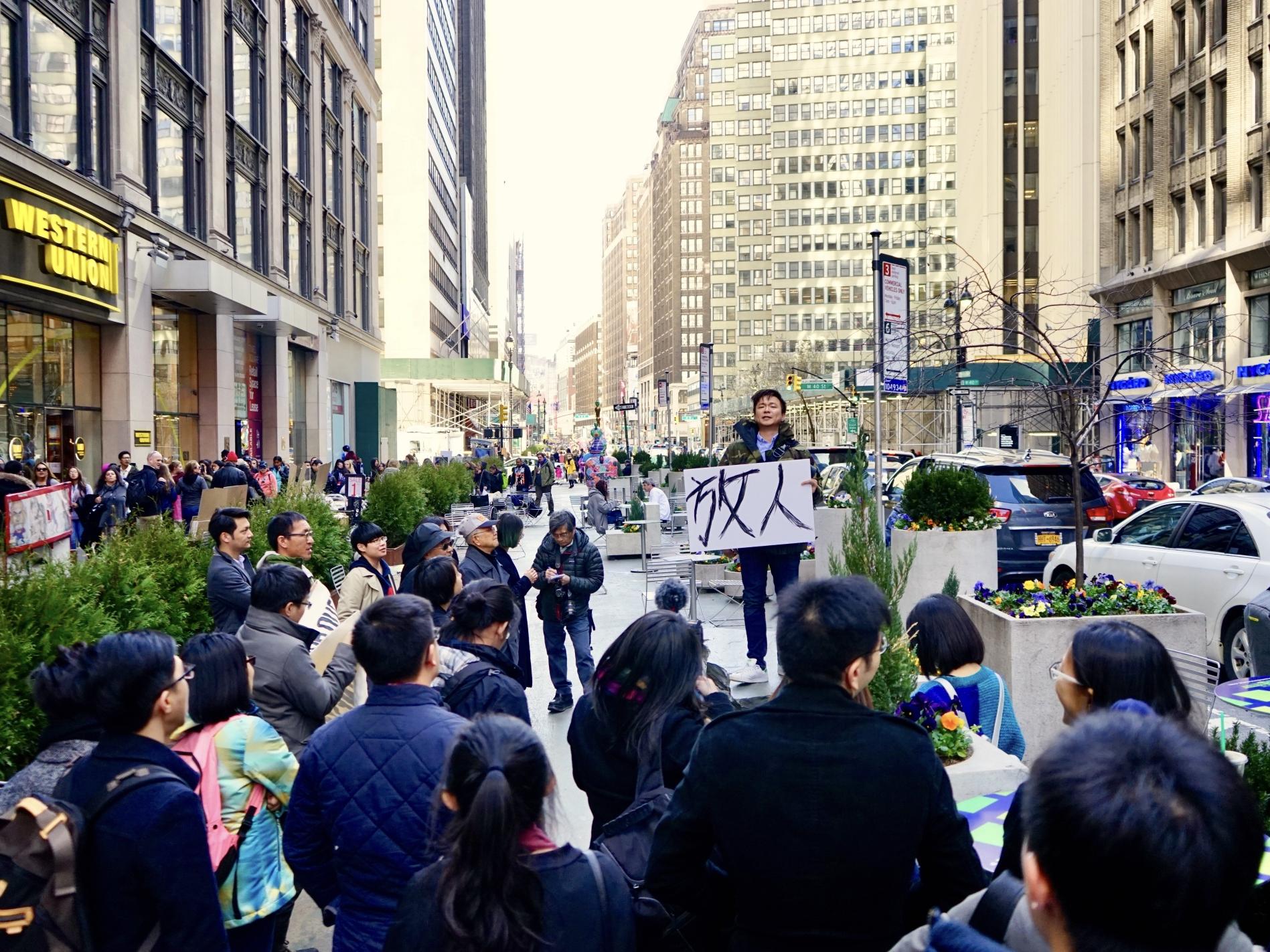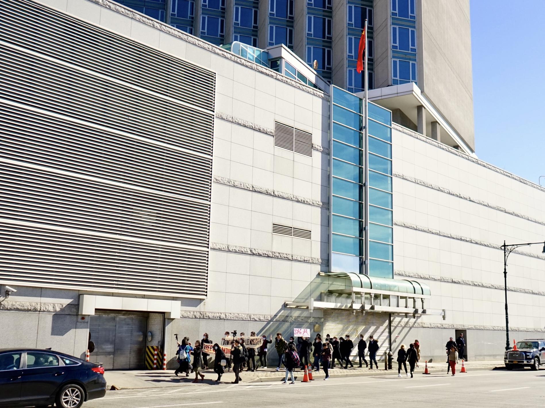 遊行隊伍「路過「中國駐紐約領事館」,並高喊抗議口號。(照片由作者本人提供)沿途遊行民眾高喊「Where is Lee? Set him free!」和「My mouth, my thoughts, China can not shut them down」英語口號,引起假日人群眾多的時報廣場和紐約巴士總站附近當地紐約客與觀光客注意。遊行隊伍並「路過」位於西四十二街與第十二大道的中國駐紐約領事館大門,為時近一小時的快閃抗議遊行活動最後在領事館外喊口號表達抗議之聲中結束。