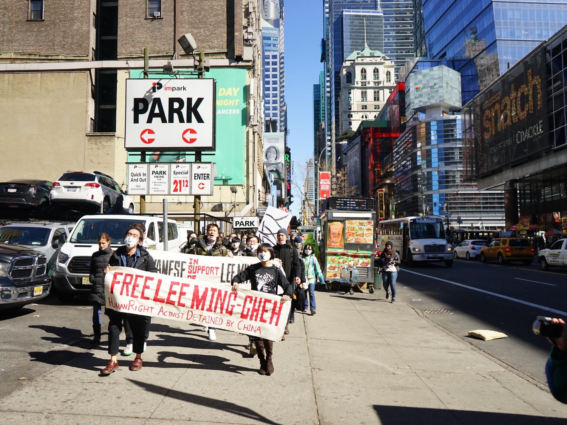 遊行隊伍行經曼哈頓最熱鬧的時報廣場與巴士總站,引起眾多路人注意。(照片由作者本人提供)活動也有發寄到「國際人權特赦組織」的明信片讓參加遊行人士簽名寄出,希望他們針對李明哲被羈押一事向中國關切交涉。遊行隊伍持著兩幅英文布條寫著「Free Lee Ming-Cheh, Human Right Activist Detained by China」和「Taiwanese in Support of Lee Ming-Cheh」和中文的「放人」標語,一行人戴上畫有封口記號的諷刺性口罩,從時報廣場行經紐約時報大樓前往曼哈頓中國駐紐約領事館表達抗議。 -