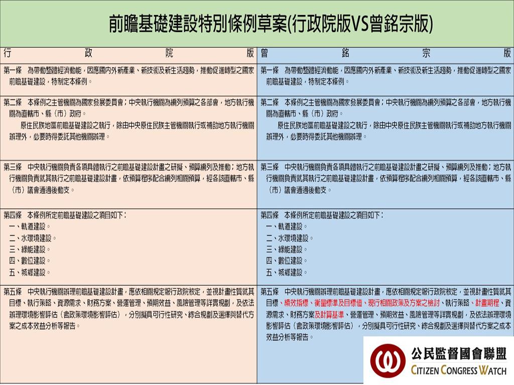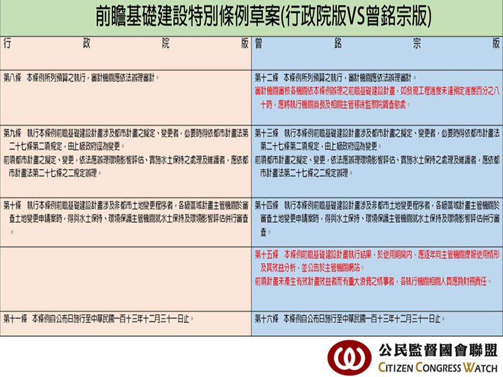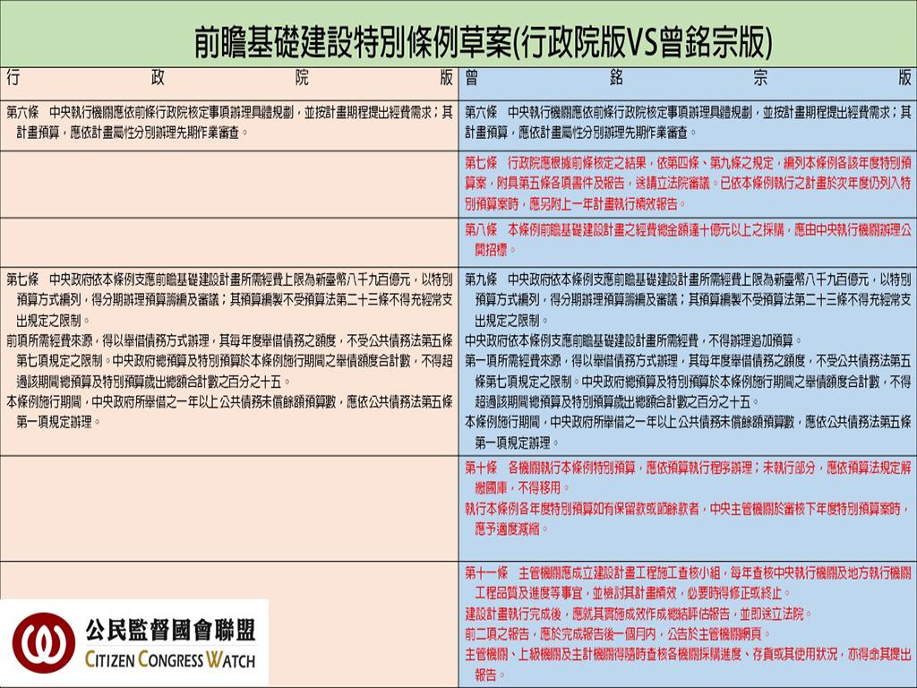 今天審查「前瞻基礎建設特別條例草案」時,國民黨委員曾銘宗也有提出版本,此項攸關國家未來8年8,800億預算以及影響世代的特別條例,從開始宣讀條文時到主席宣佈散會,僅花了20分鐘審查,以每分鐘約440億元的速度完成初審,無機會讓各黨間在委員會辯證檢驗,更無法讓民眾更了解其政策內涵!值得注意的是「前瞻基礎建設特別條例草案」六場公聽會僅做成會議記錄,並未具體回應各專家學者對於條例的質疑與批判,未來只會徒增特別預算編列的社會成本!