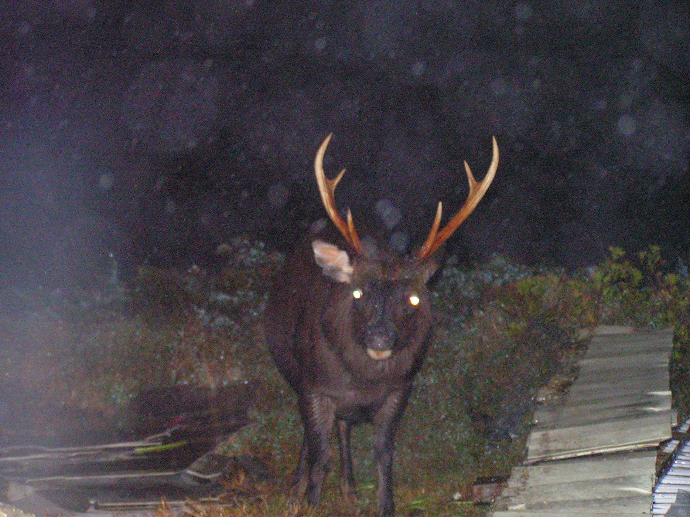 這隻水鹿很多上過嘉明湖山屋的路客都認識牠,會主動來山屋討食。(山友提供)