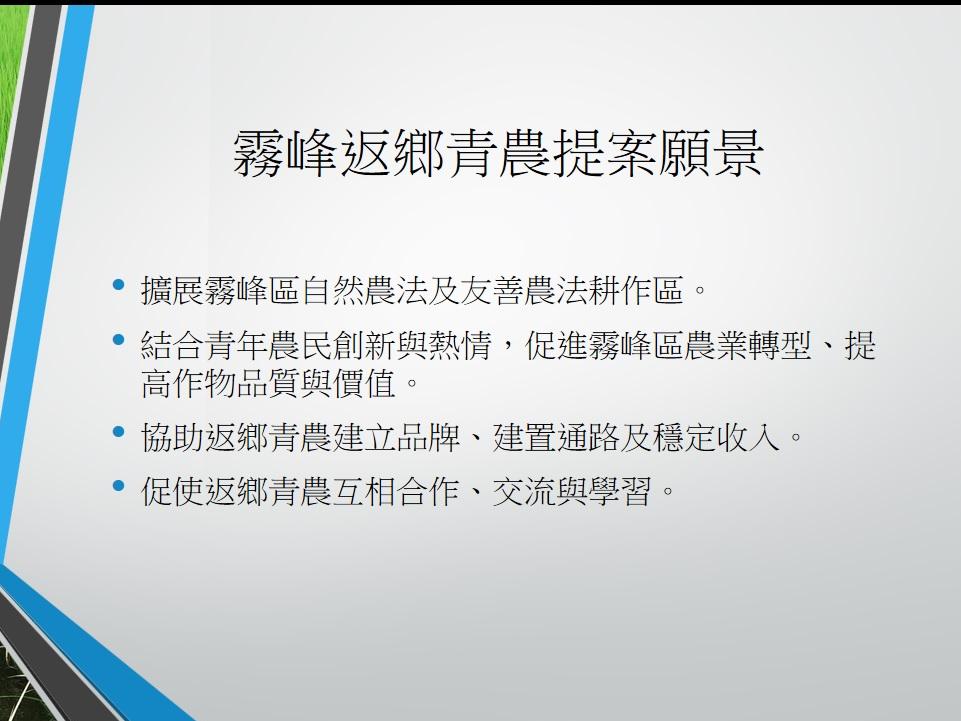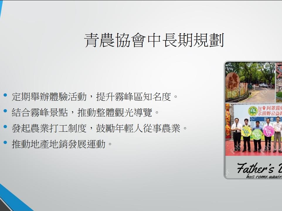 2.結合青年農民創新與熱情,促進霧峰區農業轉型,並提高農作物品質與價值。