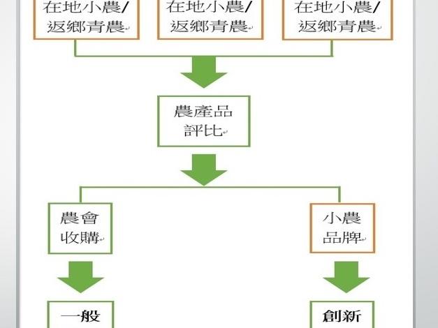 產銷班的在地農民力量為主體,加入農產品的評比制度模式,讓有心提升農產品質的農民取得有公信力的評價,進而讓評選優質的農產品,有機會進到特別為創新市場(網路購物平台、企業認購等),獲得更高的售價及利潤。